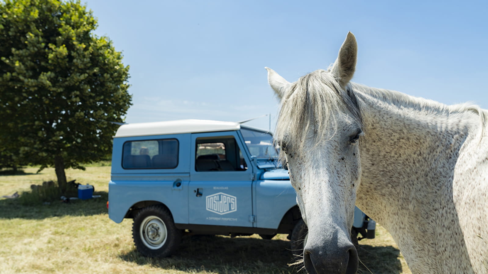 À bordo de um Defender de coleÇão, visite a região do Beaujolais. Dê ares de Safari ao seu wine tour.